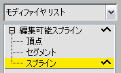 - [モディファイヤ リスト](Modifier List)から、[編集可能スプライン](Editable Spline)エントリを展開して[スプライン](Spline)をクリックします。