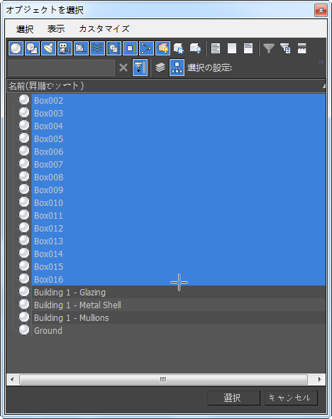 - [H] を押して、[オブジェクトを選択](Pick Object)ダイアログ ボックスを表示します。リストで Box オブジェクトをすべて選択し、[選択](Pick)をクリックします。