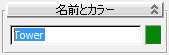 - Box01 オブジェクトを選択し、[名前とカラー](Name And Color)ロールアウトで名前を Tower に変更します。