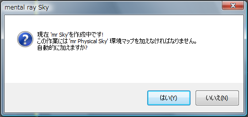 [mr Sky]を選択すると、3ds Max によって[mental ray Sky]ダイアログ ボックスが開き、mr Physical Sky 環境マップを作成するかどうかを尋ねられます。