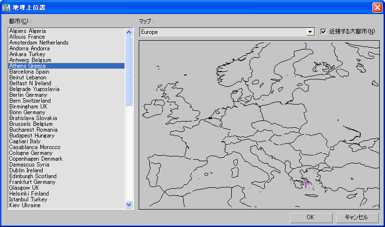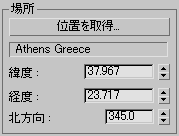 [OK]をクリックすると、3ds Max によって、デイライト システムのサン オブジェクトが実際のアテネ(ギリシャ)の緯度と経度をモデルにするように配置されます。