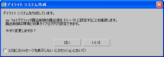3ds Max によって[デイライト システム作成](Daylight System Creation)ダイアログ ボックスが開き、mental ray に最適な露出の値を使用するかどうかを確認するメッセージが表示されます。