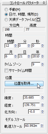 続いて、サン オブジェクトの位置を調整しましょう。シーンの地理的な場所に基づいて、空の太陽の位置を調整します。