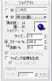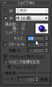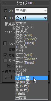 - Shape のロールアウトで、[3D]が選択された状態のままにして、[3D]ドロップダウン リストから[球 (20 面)](Sphere 20-Sides)を選択します。