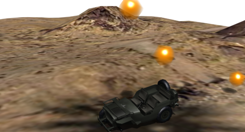 再生します。 残り火がジープから飛び、地面に落ちます。この様子が一番見やすいのは、パース ビューポートです。少し大きいように見えますが、煙のパーティクルなので、適用するマテリアルが外見の修正に役立ちます。マテリアルの作成は、次の手順の課題です。