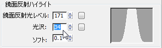 - [鏡面反射ハイライト](Specular Highlights)領域で、[鏡面反射光レベル](Specular Level)の値を 171 に、[光沢](Glossiness)の値を 34 に変更します。