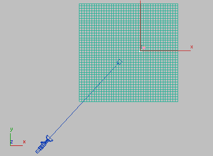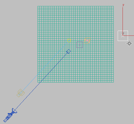- トップ ビューポートで、[風](Wind)スペース ワープをパーティクル フロー ソース アイコンのちょうど左下(南西)にドラッグして作成します。
