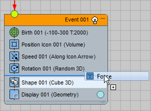 - パーティクル ビューの左下にある「コンテナ」で Force オペレータをクリックしてハイライト表示します。それをイベント表示にドラッグして、Event 01 の Shape オペレータのすぐ上にドロップします。
