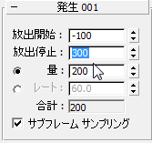 - [放出開始](Emit Start)の値を –100 に、[放出停止](Emit Stop)の値を 300 に変更します。