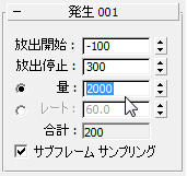 虚数のフレーム -100 から放出を開始するということは、3ds Max にアニメーションが始まる前からパーティクルを生成するように指定することを意味します。そのため、フレーム 0 の時点でシーンには既に煙があります。パーティクルの放出をアニメーションの最後のフレームである 300 で停止するということは、アニメーション全体を通して煙が表示され続けることを意味します。