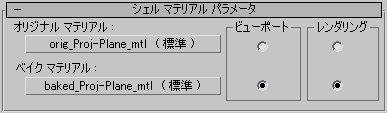 - [シェル マテリアル パラメータ](Shell Material Parameters)ロールアウトで、[ベイク処理済みマテリアル](Baked Material)をレンダリング出力で可視になるよう設定します。