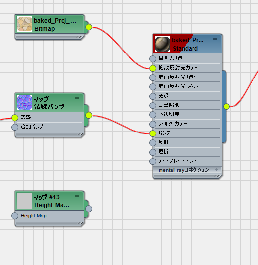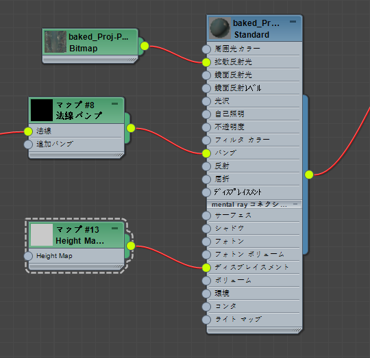 - アクティブ ビューで、baked_Proj-Plane_mtl / 標準マテリアル ノードと新しい Height Map Displacement ノードの両方がよく見えるよう