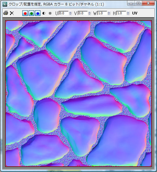マップ内のカラーには重要な意味があります。法線バンプ マップが、通常のバンプ マップに比べて、格段に多量の詳細を保持できるのは、法線バンプ マップがサーフェス詳細情報に RGB スペクトルの全域を使用するためです。通常のバンプ マップは単一のグレースケールのみを使用しています。青チャネルは、垂直方向の深さ情報を保持し、赤チャネル、緑チャネルは、各点でのサーフェス法線の方向に方向ベクトルを提供することで、この情報を補強します。より高いリアリティが得られるのはこのためです。