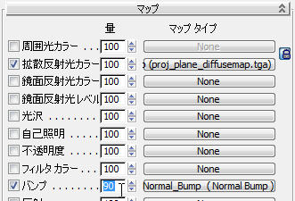 - パラメータ エディタ パネルで[マップ](Maps)ロールアウトを開き、[バンプ](Bump)の量を 90 に増やします。