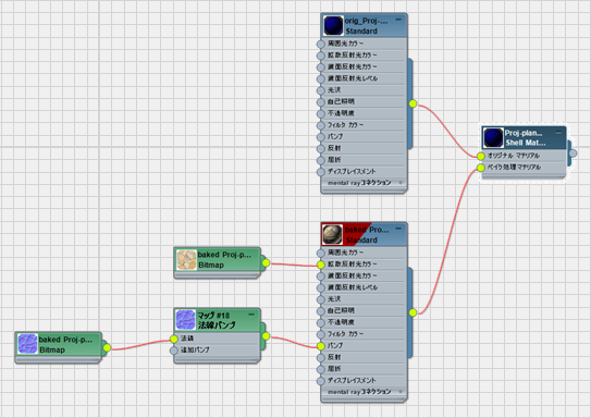 右側の最上位ノードは、先ほど見たシェル マテリアルです。その左隣は 2 つのサブマテリアルです。上がオリジナルのレンダリング可能マテリアル、下がベイク処理されたハードウェア マテリアルです。ベイク処理マテリアルには、ビットマップ ノードと法線バンプ マップ ノードがあります。 最後に、法線バンプノードは、前のレッスンでレンダリングした NormalsMap ビットマップを使用しています。