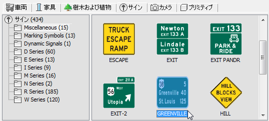 - 左側の階層でハイライト表示されている[その他](Miscellaneous)領域をハイライト表示した状態で右側のリストを下方にスクロールし、GREENVILLE というラベルの付いた標識をクリックしてハイライト表示します。
