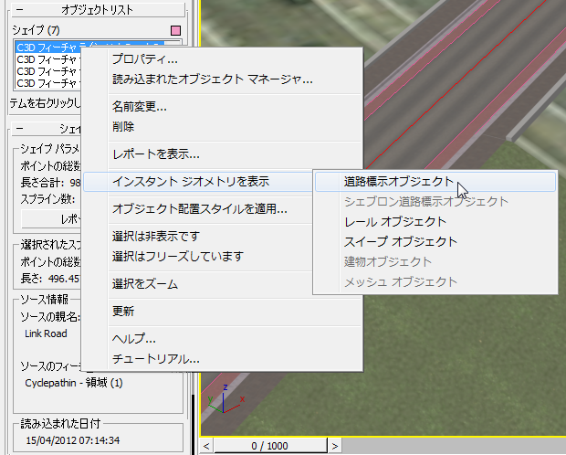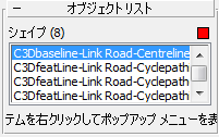 Civil View エクスプローラで、読み込んだシェイプ オブジェクトの[オブジェクト リスト](Object List)ロールアウトが下のパネルに表示されています。C3Dbaseline-Link Road-Centreline 1 がハイライト表示されています。