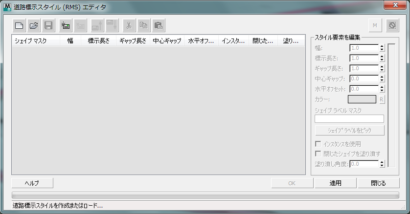 [道路標示スタイル エディタ](Road Markings Style Editor)を選択します。 3ds Max によって[道路標示スタイル(RMS)エディタ]ダイアログ ボックスが開きます。