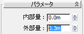 [オブジェクト空間モディファイヤ](Object-Space Modifiers)セクションから、[シェル](Shell)を選択します。[パラメータ](Parameters)ロールアウトで[外部量](Outer Amount)を 0.3m に設定します。