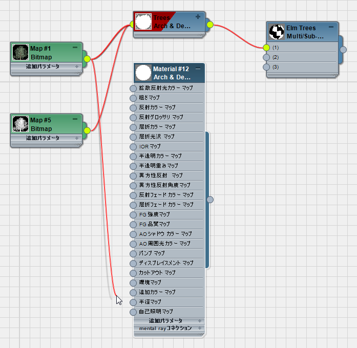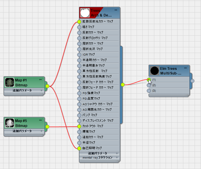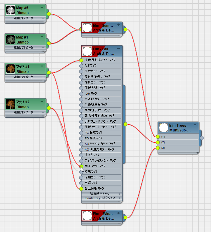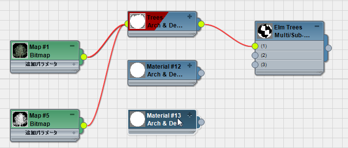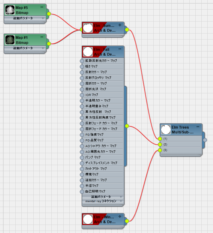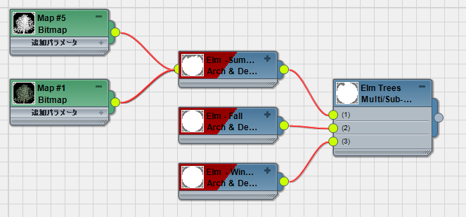 - 2 番目と 3 番目のマテリアル ノードを Elm Trees マテリアル ノードの (2) と (3) のソケットにワイヤリングして、これらもサブマテリアルにします。