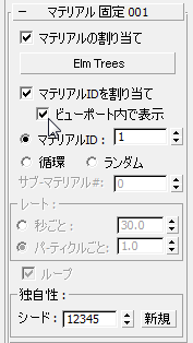 注: [ランダム](Random)オプションは、[サブ-マテリアル #](# Sub-Materials)の値が 1 よりも大きくないと使用できないため、Elm Trees マテリアルをオペレータに割り当てるまでこの設定を選択できません。