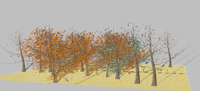 Camera01 ビューポートが更新され、3 つのタイプの木がすべてランダムに選択されて表示されます。