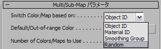 - 汚れビットマップを含むマルチ/サブ マップ ノードをダブルクリックしてパラメータを表示します。[Multi/Sub-Map パラメータ](Multi/Sub-Map Parameters)ロールアウトで、[Switch Color/Map Based On]ドロップダウン リストを開き、[Random]を選択します。