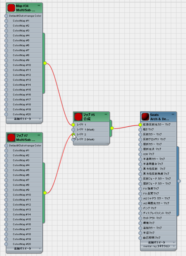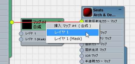 [合成](Composite))をド ッグします。アクティブ ビューで、マルチ/サブ マップと seats マテリアルをつなぐワイヤ上にマップをドロップします。 3ds Max によって、マップをワイヤに挿入していることを示すカーソルが表示されます。このカーソルが表示されたらマウスを放します。