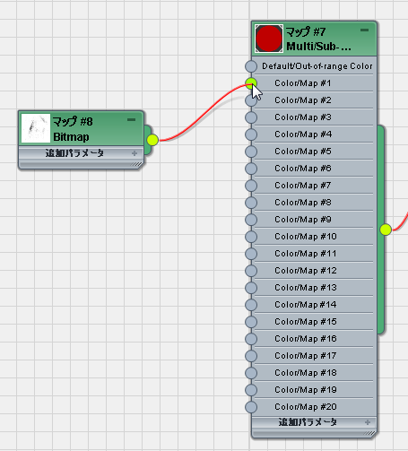 - 新しいビットマップ ノードから新しいマルチ/サブ マップの[Color/Map #1]コンポーネントにワイヤリングします。