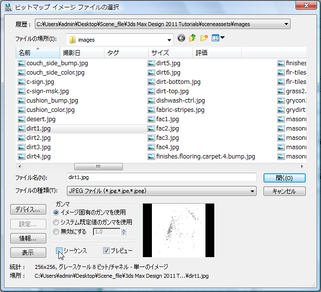 ダイアログ ボックスの右下に表示されるサムネイルで、dirt1.jpg のイメージを確認できます。