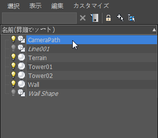 - [シーン エクスプローラ](Scene Explorer)パネルで、Camera Path をクリックして選択します。カメラ パス オブジェクトは、カメラが後を追うスプラインです。