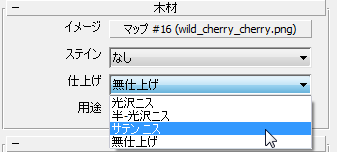 - [木目](Wood)ロールアウトで、[仕上げ](Finish)の値を[サテン ニス](Satin Varnish)に変更します。