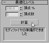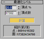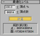 [プロ オプティマイザー](ProOptimizer)モディファイヤでモデルが分析されます。計算が終了すると、[計算](Calculate)の下のテキスト ボックスに、モデルの統計情報が表示されます。