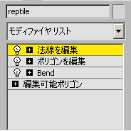 Reptile モデルを選択してモディファイヤ スタックを見ると、Mudbox からの読み込みによって、[法線を編集モディファイヤ](Edit Normals modifier)と[ポリゴンを編集モディファイヤ](Edit Poly modifier)という 2 つのモディファイヤがスタックに追加されていることがわかります。