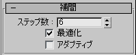このチェック ボックスにチェックマークが付いている場合、各スプラインに滑らかなカーブを生成するためのステップ数が自動的に設定されます。直線セグメントに設定されるステップ数は、常に 0 です。チェックマークを消すと、[最適化](Optimize)と[ステップ数](Steps)を使用して、手動による補間コントロールが使用可能になります。既定値ではチェックマークが付いていません。