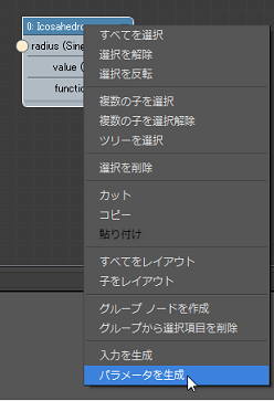 [パラメータ: 単一](Parameter: Single)ノードがエディタ ウィンドウに表示されます。このノードは既に[20 面体](Icosahedron)ノードの入力コネクタに接続されています。これは、[パラメータ: 単一](Parameter: Single)ノードを検索し、ウィンドウにドラッグして、入力コネクタに接続するための便利なショートカットです。