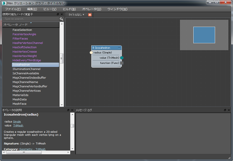 このノードには、20 面体オブジェクトを作成するための基本的な機能が含まれています。左側に「半径(シングル)」というラベルが付いた入力コネクタがあり、右側に「値(TriMesh)」というラベルが付いた出力コネクタがあることに注意してください(この手順では関数コネクタは使用しません)。ご覧のように、ロジックは左から右に流れます。これはすべての MCG グラフに当てはまります。