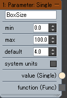パラメータがグラフ出力のインタフェースに表示され(この例では BoxSize というラベル)、グラフのユーザはインタフェースで値を入力できるようになります。[パラメータ: 単一](Parameter: Single)ノードを使用すると、単精度浮動小数点数、つまり小数を指定することができます。グラフのデザイナーは、ユーザ入力を特定の値の範囲に制限したり、既定値を指定することができます。
