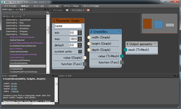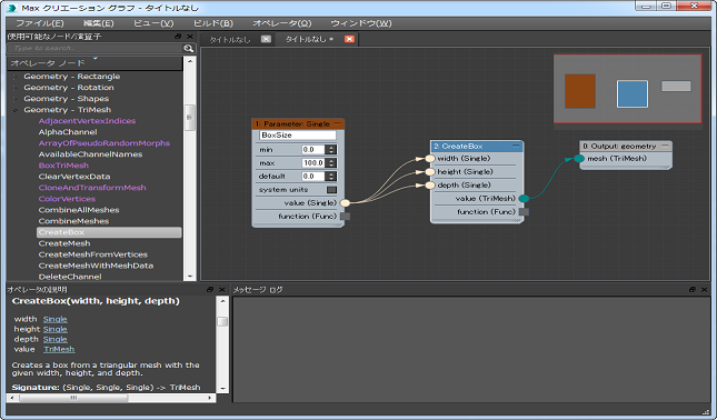 次のステップでは、[CreateBox]ノードによって生成される未加工データを、3ds Max で使用できるジオメトリ ノードに変換します。