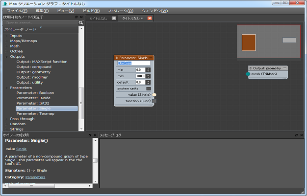 - [使用可能なノード/演算子](Available Nodes/Operators)リストの[パラメータ](Parameters)カテゴリを展開し、[パラメータ: 単一](Parameter: Single)ノードをグラフ ウィンドウの左側近くにドラッグします。テキスト フィールド(現在「name」と表示)をダブルクリックし、テキストを編集して BoxSize にし、[Enter]キーを押します。