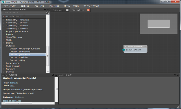 - エディタ ウィンドウの左側にある[使用可能なノード/演算子](Available Nodes/Operators)リストで、[出力](Outputs)カテゴリまでスクロールして展開し、[出力: ジオメトリ](Output: geometry)ノードをグラフ ウィンドウの右側近くにドラッグします。