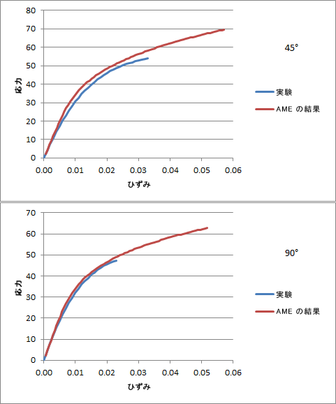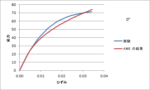 実験から得られた 0 度でのデータと Advanced Material Exchange からの出力が、非常によく一致していることがわかります。Advanced Material Exchange では応力に基づいた破損基準が使用されています。そこで、各曲線で得られる極限応力が非常に類似しているという事実は、今後もこのツールを信頼して使用できるという自信を与えてくれます。