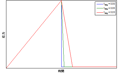 ここで、ti、tf、tdeg は、それぞれ現在の時間、破損開始時間、劣化時間(ユーザ材料定数 11)です。下図は、劣化期間のさまざまな時間値(破損開始後は一定のひずみ)に対する時間の関数としてのローカルの材料応答を示しています。