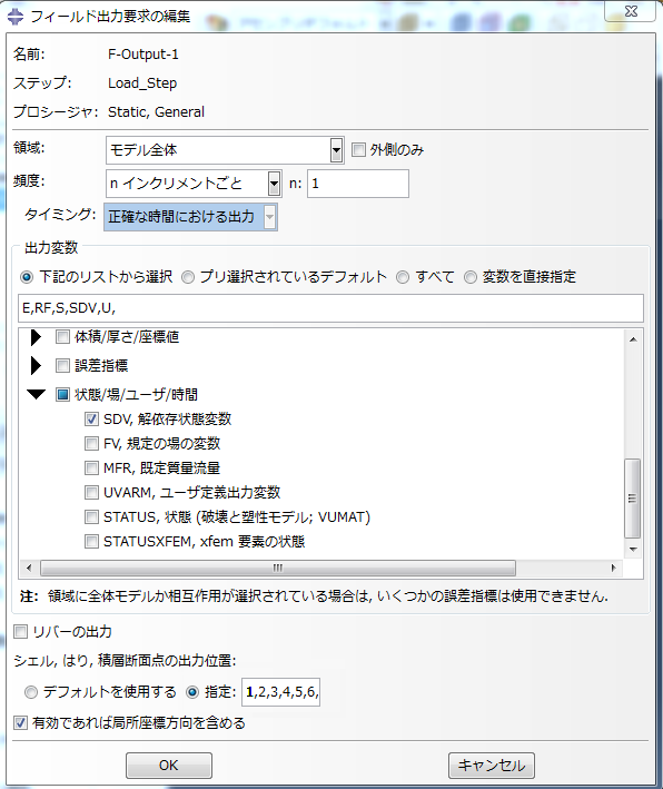 - 以下に示すように、SDV のボックスをオンにすることにより、[Output Variables]のリストにSDVを追加します。これで、状態変数が Abaqus 出力(.odb)ファイルに出力されるようになります。