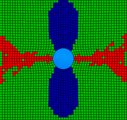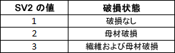 次の表は、SV2 に設定可能な値とその対応する破損状態の一覧です。スペクトルを 3 色のみに減らし、要素の色を一定に保つようにユーザ定義の範囲を指定することが効果的な場合があります。たとえば、15 色のスペクトルと母材破損のみがある場合、Patran は自動的に 1~2 の範囲に制限値を調整し、赤色の要素は母材破損に対応します。しかし、繊維破損が発生した場合は、赤色の要素が母材破損ではなく繊維破損に対応するように、範囲は 1~3 に調整されます。スペクトルと値の範囲を変更することで、SV2 は常に 1~3 になります。