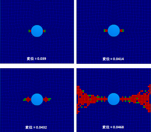 次に、主な荷重(0°)がかかっている層の 1 つである、Ply 2 の破損の進行を確認してください。次のプロットは、いくつかの変位における Ply 2 の破損を表示しています。予測したとおり、破損はノッチのエッジで開始し、最終的な破損が発生するまで、プレートのエッジに向けて横方向に進行していきます。