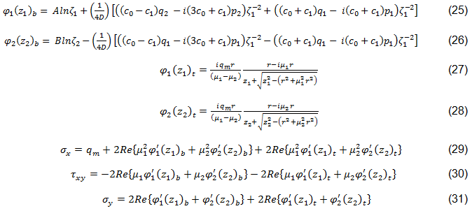 この重ね合わせ方式で使用される複素応力関数は Lekhnitskii および Aluko によるものに基づき、方程式25 ~ 31 に示されます[45、44]。下付き文字 b および t は、それぞれ穴の埋められた解析と穴の空いた解析を示します。