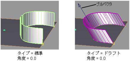 Draft – 指定した牽引方向のベクトルに対して一定の角度で延長したサーフェスを作成します。既定では、サーフェスはプル ベクタに対して平行です。