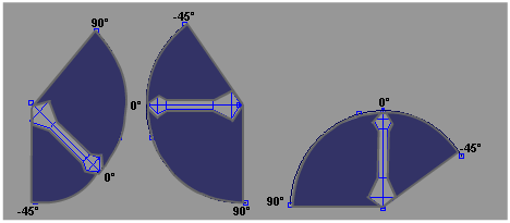最初に描画されたボーンの方向を基準に 0 度の位置が決められます。ボーンを斜めに描画した場合、前の例で示した最小および最大レンジは次のようになります。