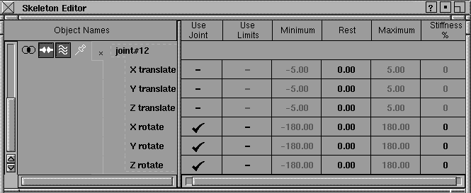 Skeleton Editor の右側には、各 Joint ノードコンポーネントの値を編集するためのスプレッドシートがあります。編集できるのはジョイントの値だけです。このウィンドウに表示される他のオブジェクトを編集する前に、これらのオブジェクトをジョイントに変更する必要があります。